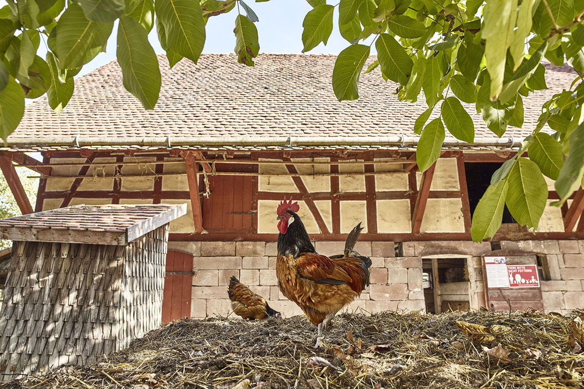 Strolling through the grounds, one can definitely get lost in the authentic details. This is exactly what the museum is known for: It invites visitors to walk in the footsteps of our ancestors who lived far more simply and authentically than we do today. This authenticity can be experienced with all senses. Walls sometimes feel warm, sometimes cool, depending on the building’s use. The wood of church pews or school benches is smooth. The air smells of hay, floor wax, and earth. One can almost hear the splashing of the stone fountains, the crackle of a fire in the cast-iron stove, or the clatter of dishes just before supper. Some buildings are furnished true to the original time period and serve as examples of village and small-town everyday life. The kitchens, living rooms and bedrooms paint a vivid picture of home life through to the 20th century. In craft workshops, visitors discover the tools typical of traditional trades; blacksmiths, basket weavers and others are at work in regular demonstrations. Just past the entrance to the park, the marketplace square building group opens up. The half-timbered houses here house historical exhibits, an old pharmacy and a print shop. There is also a tavern and several stores, which provide opportunity to experience and enjoy.